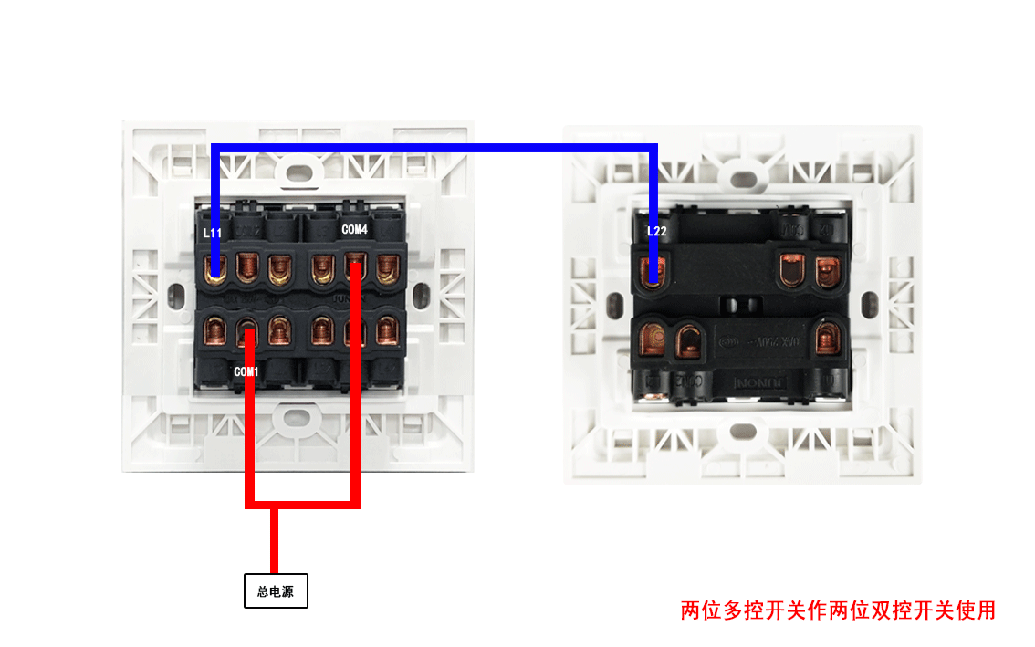 将两位多控开关上多余的线去掉,从总电源中分支两条火线分别接入多控开关的【COM1】端和【COM4】端,然后从两位双控开关的【L22】端引一根零线进两位多控开关的【L11】端,再从两位双控开关的【L21】端引一根火线进两位多控开关的【L12】端;